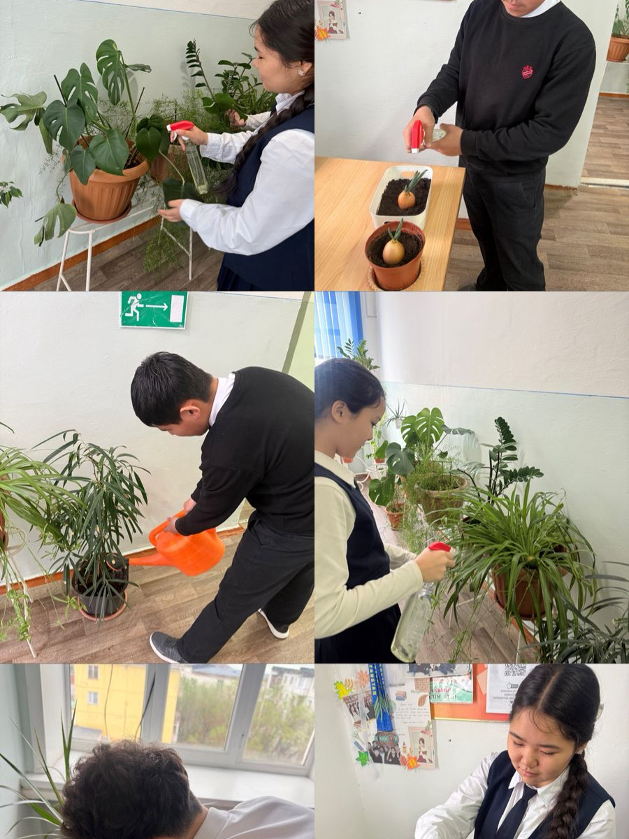 Биология сабағында 8 «А» сыныбымен мектептегі бөлме өсімдіктерін абаттандыру және күтіп-баптау жұмыстары жүргізілді.